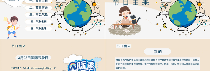 一、節(jié)日由來二、節(jié)日歷史三、常見氣象四、氣象名詞五、氣象生活