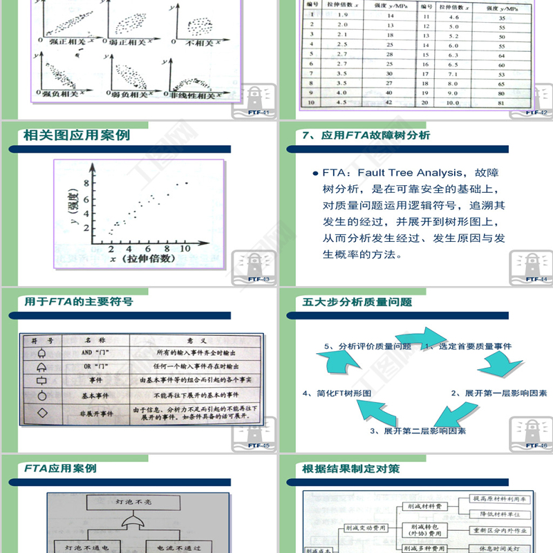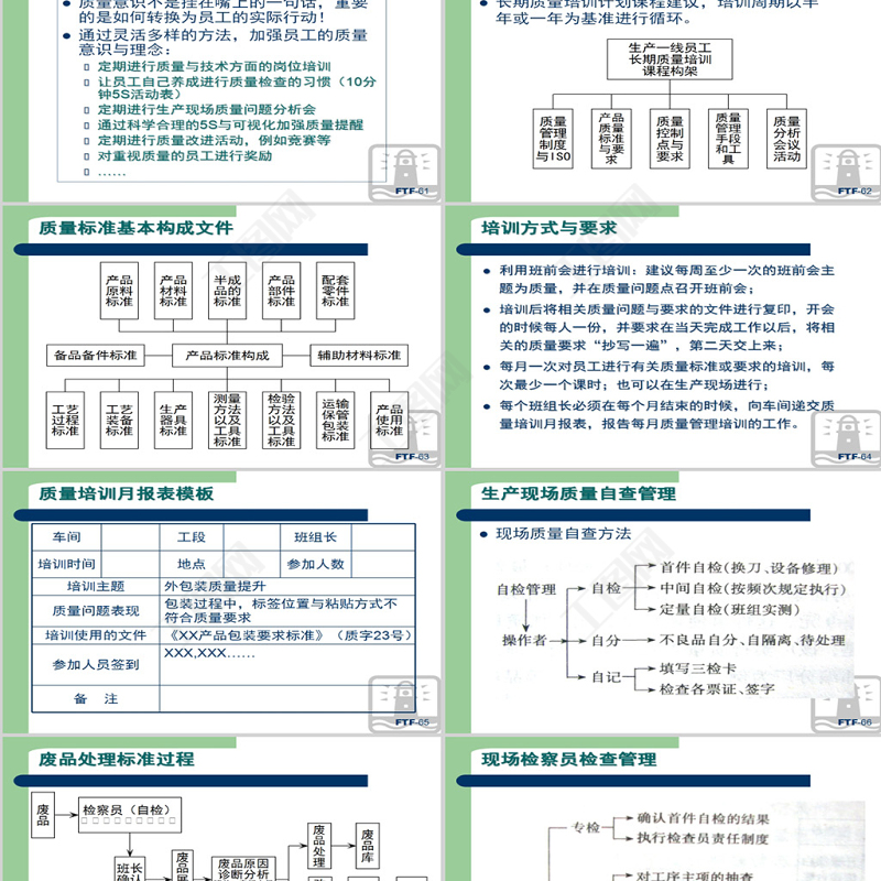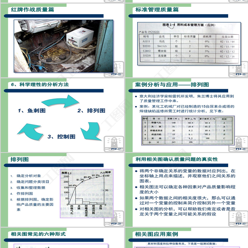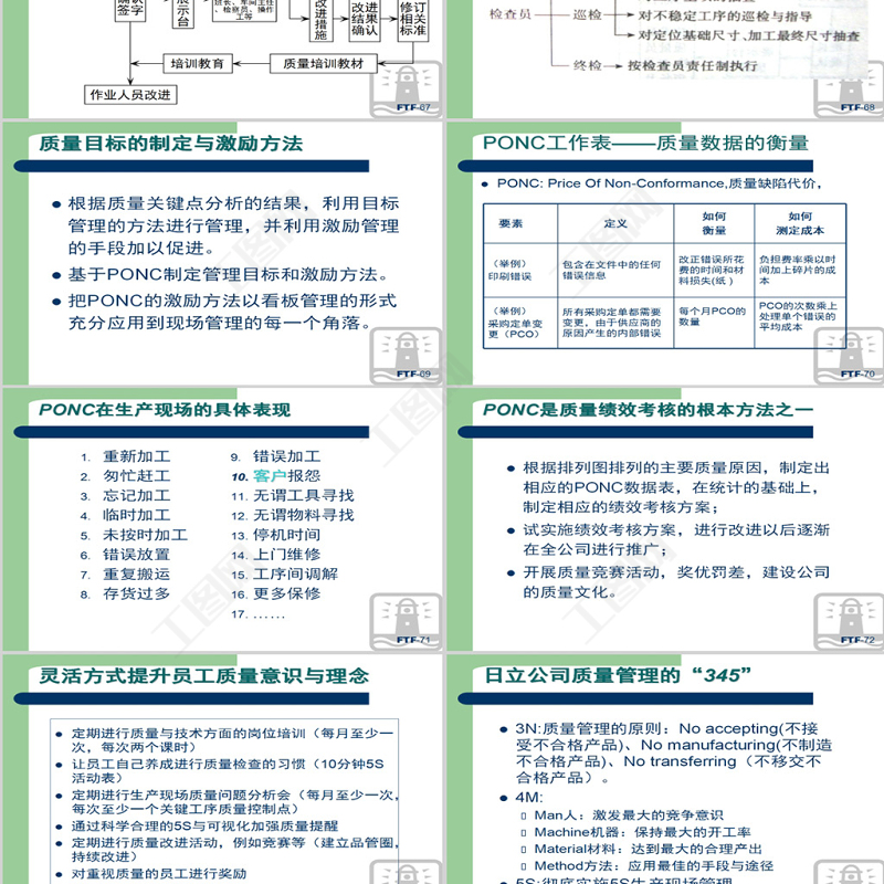 <p>生產(chǎn)現(xiàn)場品質(zhì)管理方法“10+1”FTF首席培訓(xùn)教練—劉**</p><br><p>本次課程提綱現(xiàn)場質(zhì)量管理角色篇品質(zhì)管理十大方法應(yīng)用員工質(zhì)量意識與理念提升方法與步驟現(xiàn)場質(zhì)量改進提升案例分析與應(yīng)用</p><br><p>一、現(xiàn)場質(zhì)量管理角色篇準(zhǔn)確理解什么是質(zhì)量?影響產(chǎn)品質(zhì)量的六大因素質(zhì)量特性五大方面質(zhì)量形成四個階段</p><br><p>準(zhǔn)確理解什么是質(zhì)量?寶馬的質(zhì)量比奧拓汽車的質(zhì)量好?價格高的產(chǎn)品比價格低的產(chǎn)品質(zhì)量好?純鈦的眼鏡架比合金的質(zhì)量好?……</p><br><p>質(zhì)量就是符合相關(guān)的規(guī)格標(biāo)準(zhǔn)</p><br><p>影響產(chǎn)品質(zhì)量的六大因素</p><br><p>產(chǎn)品質(zhì)量特性的五大方面</p><br><p>產(chǎn)品質(zhì)量形成的四個階段</p><br><p>產(chǎn)品使用質(zhì)量的三大表現(xiàn)</p><br><p>六大因素具體表現(xiàn)</p><br><p></p><br><p>生產(chǎn)管理者的質(zhì)量角色車間管理者和班組長必須準(zhǔn)確認(rèn)識自己的質(zhì)量職責(zé),采取有效的管理、控制與提升方法,持續(xù)改善現(xiàn)場產(chǎn)品質(zhì)量;(學(xué)習(xí))車間管理者必須通過多樣的手段進行質(zhì)量管理,包括員工培訓(xùn)、設(shè)備維護、計量器具維護、5S與可視化管理應(yīng)用、工序分析應(yīng)用等方法,保證質(zhì)量標(biāo)準(zhǔn)的實現(xiàn);(執(zhí)行)讓所有的生產(chǎn)人員掌握質(zhì)量問題分析工具,持續(xù)進行質(zhì)量改進,修訂相關(guān)的SOP,確保質(zhì)量的持續(xù)改進;(持續(xù)改進)</p><br><p>按照六大步驟切實落實質(zhì)量工作整理整頓現(xiàn)場,使得質(zhì)量問題容易發(fā)現(xiàn);使用科學(xué)的方法標(biāo)示和提醒質(zhì)量關(guān)鍵點;持續(xù)切實做好質(zhì)量意識與方法的培訓(xùn);密切配合品質(zhì)部門做好質(zhì)量的監(jiān)控工作;科學(xué)統(tǒng)計和分析質(zhì)量問題發(fā)生的概率;分析質(zhì)量問題的具體表現(xiàn),帶領(lǐng)全體員工改進質(zhì)量;</p><br><p>二、品質(zhì)管理十大方法應(yīng)用現(xiàn)場產(chǎn)品質(zhì)量的問題焦點現(xiàn)場質(zhì)量問題的分析方法與應(yīng)用應(yīng)用FTA故障樹分析現(xiàn)場質(zhì)量案例分析與應(yīng)用</p><br><p>現(xiàn)場產(chǎn)品質(zhì)量的十大問題焦點質(zhì)量標(biāo)準(zhǔn)的清晰程度:標(biāo)準(zhǔn)嚴(yán)格的質(zhì)量管理系統(tǒng):管理各級人員的質(zhì)量意識:意識產(chǎn)品質(zhì)量環(huán)節(jié)的分析:環(huán)節(jié)細(xì)致的質(zhì)量提醒標(biāo)識:提醒科學(xué)理性的分析方法:分析應(yīng)用FTA故障樹分析:方法有效的質(zhì)量改進方法:改進及時的質(zhì)量控制手段:鞏固持續(xù)改善的質(zhì)量環(huán)境:持續(xù)改善</p><br><p>1、質(zhì)量標(biāo)準(zhǔn)常見的表現(xiàn)形式質(zhì)量標(biāo)準(zhǔn)文件:例如加工圖紙、加工工藝標(biāo)準(zhǔn)、配方比例、作業(yè)指導(dǎo)書等;階段工藝特別要求指導(dǎo)書;質(zhì)量標(biāo)準(zhǔn)照片:合格品與不合格品的區(qū)別表現(xiàn)照片等;不合格品的展示臺:把不合格品展示出來;優(yōu)等產(chǎn)品展示臺:把優(yōu)等的產(chǎn)品展示出來</p><br><p>質(zhì)量展示臺案例——良好表現(xiàn)</p><br><p>質(zhì)量標(biāo)準(zhǔn)管理案例——差表現(xiàn)</p><br><p>2、車間現(xiàn)場質(zhì)量管理系統(tǒng)組織工作與執(zhí)行質(zhì)量;管理工作與執(zhí)行質(zhì)量;技術(shù)工作與執(zhí)行質(zhì)量;培訓(xùn)工作與執(zhí)行質(zhì)量;現(xiàn)場5S與可視化管理工作與執(zhí)行質(zhì)量;持續(xù)改善工作與執(zhí)行質(zhì)量;公司內(nèi)部服務(wù)工作與執(zhí)行質(zhì)量;其他與質(zhì)量相關(guān)的、制造系統(tǒng)的工作與執(zhí)行質(zhì)量;……</p><br><p>現(xiàn)場質(zhì)量管理案例</p><br><p>質(zhì)量問題分析方法——魚刺圖</p><br><p>魚刺圖應(yīng)用案例</p><br><p>3、各級人員的質(zhì)量意識質(zhì)量意識不是一再地用語言進行強調(diào),而是具體工作的落實情況。車間主任:是否至少每周一次車間質(zhì)量分析會議;是否堅持現(xiàn)場監(jiān)督與督促質(zhì)量工作的落實;是否為車間進行質(zhì)量改進與改善工作提供方便;班組長:是否堅持每周班前會現(xiàn)場進行至少一個質(zhì)量問題的分析;是否把5S與可視化管理工作和質(zhì)量工作結(jié)合;是否每天定時進行質(zhì)量問題的統(tǒng)計;是否召集所有的員工參加班組現(xiàn)場質(zhì)量問題分析;是否堅持執(zhí)行質(zhì)量改善小組的工作;……</p><br><p>質(zhì)量意識管理案例</p><br><p>4、產(chǎn)品質(zhì)量環(huán)節(jié)的分析制作以“加工、搬運、停留、停滯、數(shù)檢、質(zhì)檢”為單位的質(zhì)量形成過程流程圖;通過質(zhì)量問題的統(tǒng)計分析,確定質(zhì)量問題的“重災(zāi)區(qū)”;通過數(shù)據(jù)統(tǒng)計,確定質(zhì)量問題的性質(zhì),制定具有針對性的質(zhì)量問題解決方案;執(zhí)行質(zhì)量問題解決方案;鞏固改進效果,修訂SOP,進行培訓(xùn);循環(huán)以上的工作過程,持續(xù)改進和提升各個質(zhì)量環(huán)節(jié)。</p><br><p>質(zhì)量環(huán)節(jié)管理案例</p><br><p>物料的六種狀態(tài)與符號加工搬運停留