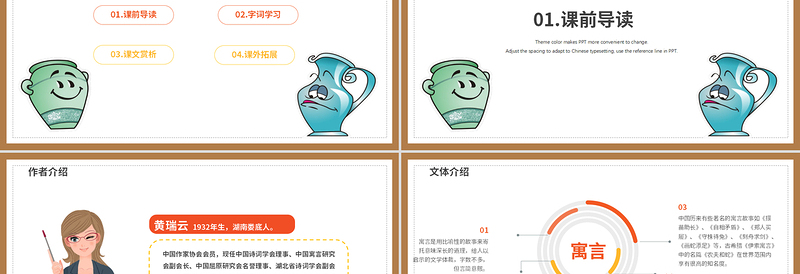 01.課前導(dǎo)讀Theme color makes PPT more convenie nt to change. Adjust the spacing to adapt to Chinese typesetting, use the reference line in PPT.