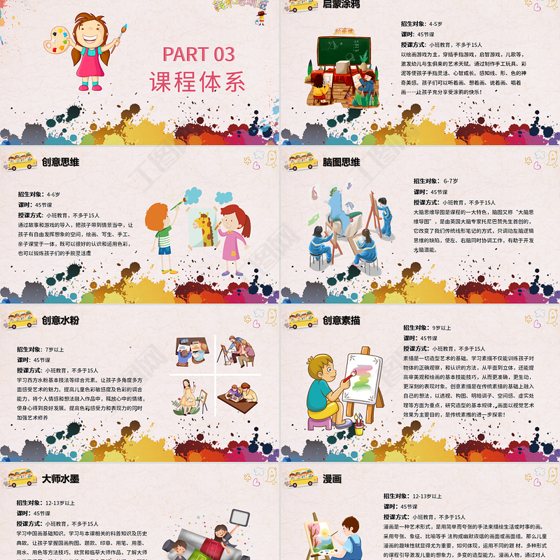 工圖網(wǎng)提供少兒美術(shù)培訓(xùn)招生興趣繪畫班PPT模版供會(huì)員免費(fèi)下載。更多精彩黨課PPT素材,盡在工圖網(wǎng)。