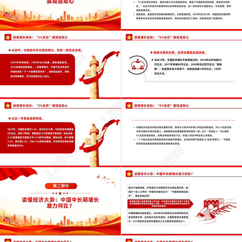 中國經(jīng)濟增長潛力幾何PPT紅色精美兩會中國經(jīng)濟九問九答之一系列課件 Array