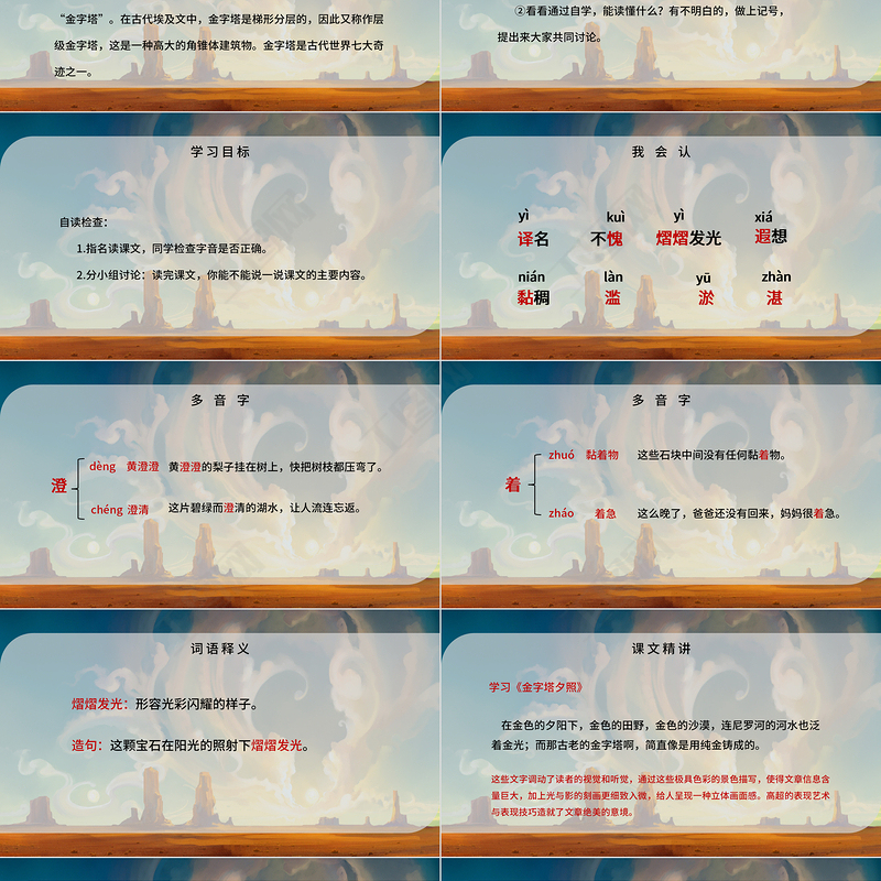 《金字塔夕照》既是一篇典型的“風(fēng)貌通訊”,又是一篇獨(dú)具匠心、極具意境之美的散文。在作者流暢又飽含韻味的文筆下,展現(xiàn)出了一幅幅金字塔在夕陽(yáng)照耀下的美麗圖景,描述厚重文化遺產(chǎn),歌頌人類(lèi)偉大創(chuàng)造。課文精講