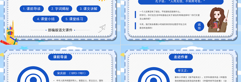 課前導(dǎo)讀一個(gè)人如果沒有了誠信,不知道他還能做什么。 同學(xué)們,你們?cè)谏钪杏忻媾R過關(guān)于誠信的兩難選擇嗎?你們又是怎么做的呢?今天,我們就去看看小時(shí)候的宋慶齡在是否守信之間是怎樣選擇的!孔子說:“人而無信,不知其可也?!闭\信
