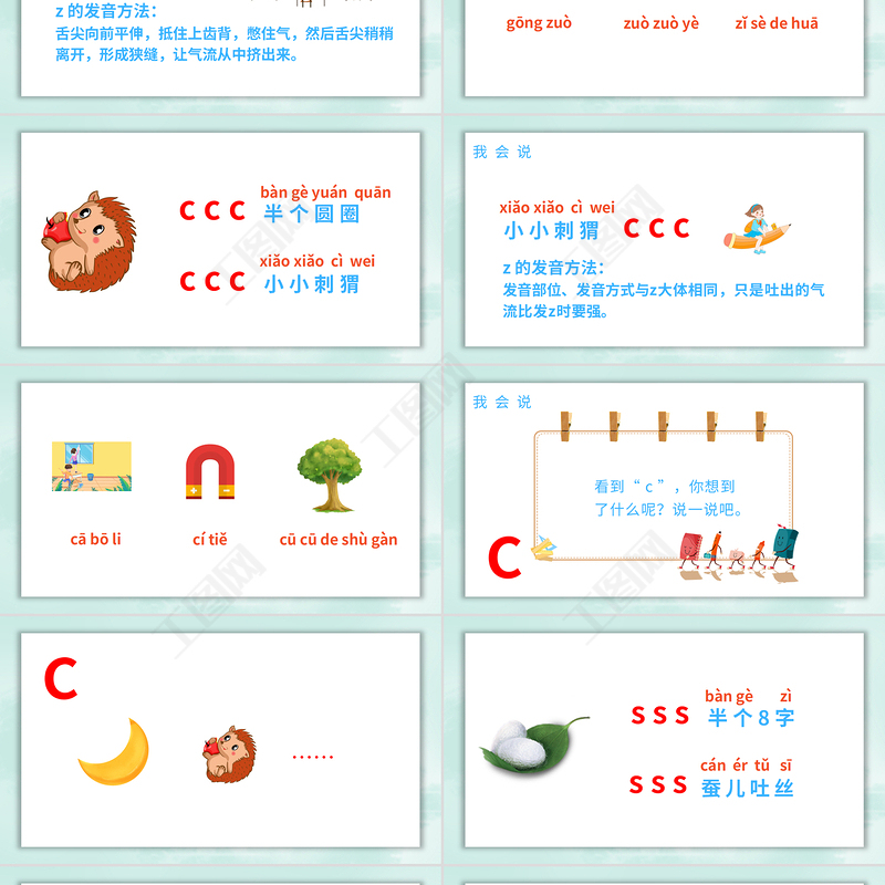 z 的發(fā)音方法: 發(fā)音部位、發(fā)音方式與z大體相同,只是吐出的氣流比發(fā)z時(shí)要強(qiáng)。小小刺猬xiǎo xiǎo cì weic c c我會(huì)說
