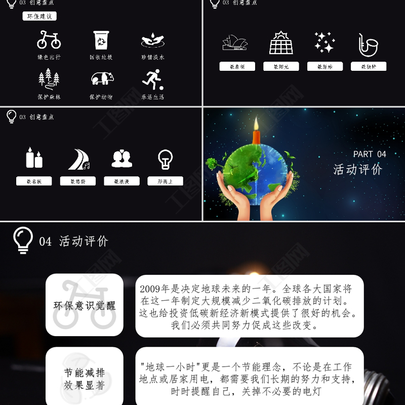04 活動(dòng)評(píng)價(jià)環(huán)保意識(shí)覺(jué)醒節(jié)能減排效果顯著2009年是決定地球未來(lái)的一年。全球各大國(guó)家將在這一年制定大規(guī)模減少二氧化碳排放的計(jì)劃。這也給投資低碳新經(jīng)濟(jì)新模式提供了很好的機(jī)會(huì)。我們必須共同努力促成這些改變。"地球一小時(shí)"更是一個(gè)節(jié)能理念,不論是在工作地點(diǎn)或居家用電,都需要我們長(zhǎng)期的努力和支持,時(shí)時(shí)提醒自己,關(guān)掉不必要的電燈