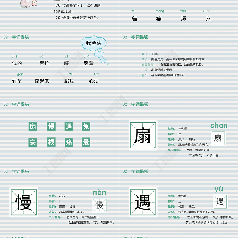 02 字詞揭秘結(jié)構(gòu): 部首: 組詞: 造句: 書(shū)寫(xiě)指導(dǎo): 左右 忄 慢慢 緩慢 汽車緩慢地開(kāi)來(lái)了。 左窄右寬,第三筆豎要長(zhǎng), 右上部筆畫(huà)緊湊,“又”筆畫(huà)舒展。màn