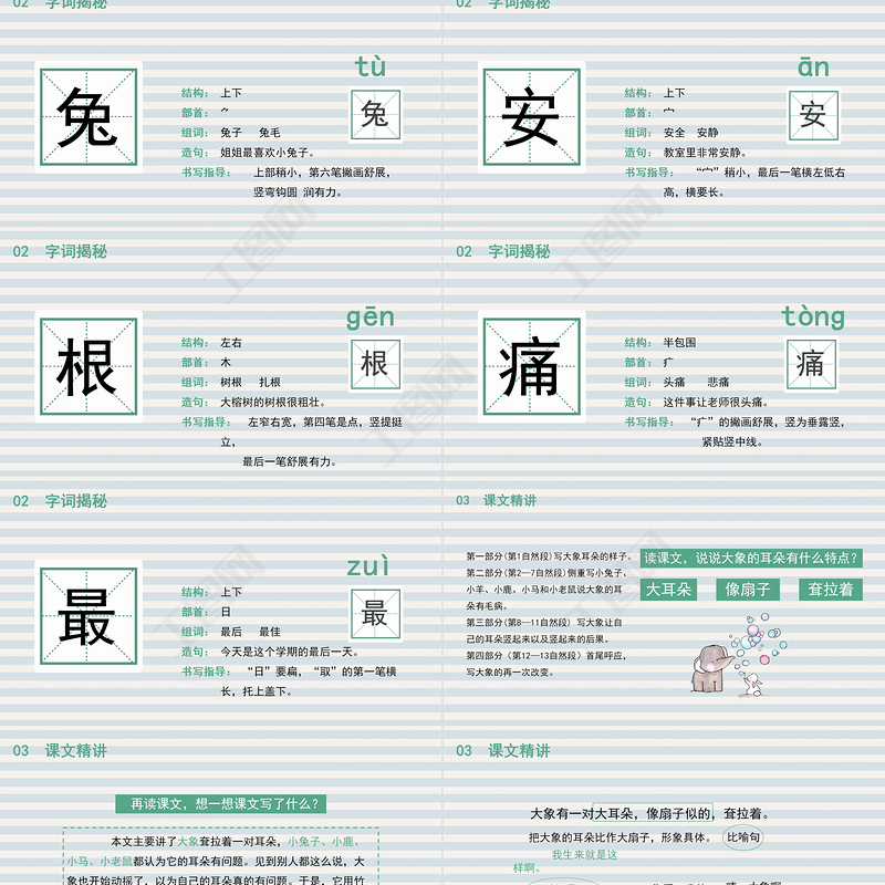 這句話是說(shuō)要堅(jiān)持自己的特點(diǎn),保持自己的優(yōu)點(diǎn)。不要隨便改變自己的優(yōu)點(diǎn)。結(jié)合生活實(shí)際,說(shuō)說(shuō)你是怎么理解“人家是人家,我是我”這句話的。 哥哥吉他彈得很好,經(jīng)常參加演出得獎(jiǎng)。我不如他彈得好,但是我畫(huà)的畫(huà)很好。所以我不要去練習(xí)吉他,而放棄了自己畫(huà)畫(huà)的特長(zhǎng)。03 課文精講 本文用淺顯易懂的語(yǔ)言給我們講了大象的耳朵的特點(diǎn)和作用,通過(guò)大象的做法告訴我們要學(xué)會(huì)珍惜自己的東西,不要盲目學(xué)習(xí)別人。 課文主旨