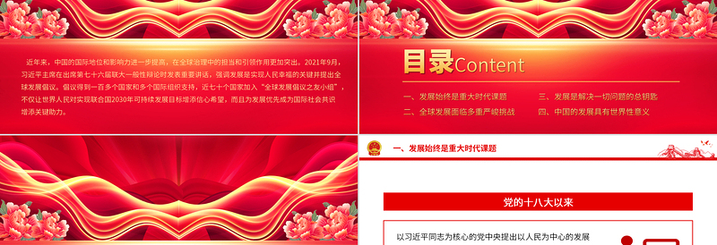 目錄一、發(fā)展始終是重大時代課題 二、全球發(fā)展面臨多重嚴(yán)峻挑戰(zhàn) Content三、發(fā)展是解決一切問題的總鑰匙 四、中國的發(fā)展具有世界性意義
