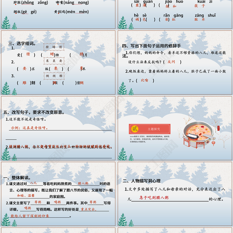 二、人物描寫洞心理1.文中多處描寫了八兒和母親的對話,充分表達(dá)出了八兒_________________________________的心理。急于吃到臘八粥