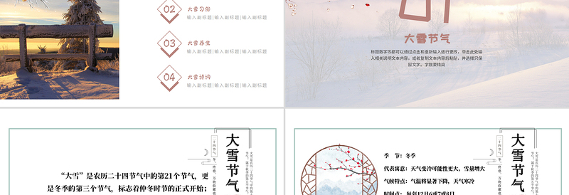 01大雪節(jié)氣標(biāo)題數(shù)字等都可以通過(guò)點(diǎn)擊和重新輸入進(jìn)行更改,單擊此處輸入相關(guān)說(shuō)明文本內(nèi)容,或者復(fù)制文本內(nèi)容后粘貼,并選擇只保留文字。字?jǐn)?shù)要精簡(jiǎn)