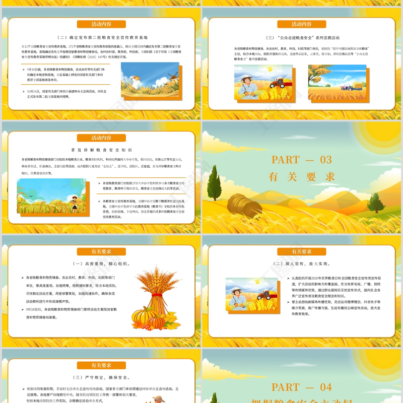 活動內(nèi)容(一)世界糧食日和全國糧食安全宣傳周主題展宣傳周期間,舉辦世界糧食日和全國糧食安全宣傳周主題展,深入宣傳黨中央、國務(wù)院關(guān)于糧食安全重要戰(zhàn)略部署;展示全國糧食安全宣傳周活動主題、活動內(nèi)容,近年來糧食安全宣傳教育活動開展情況等;