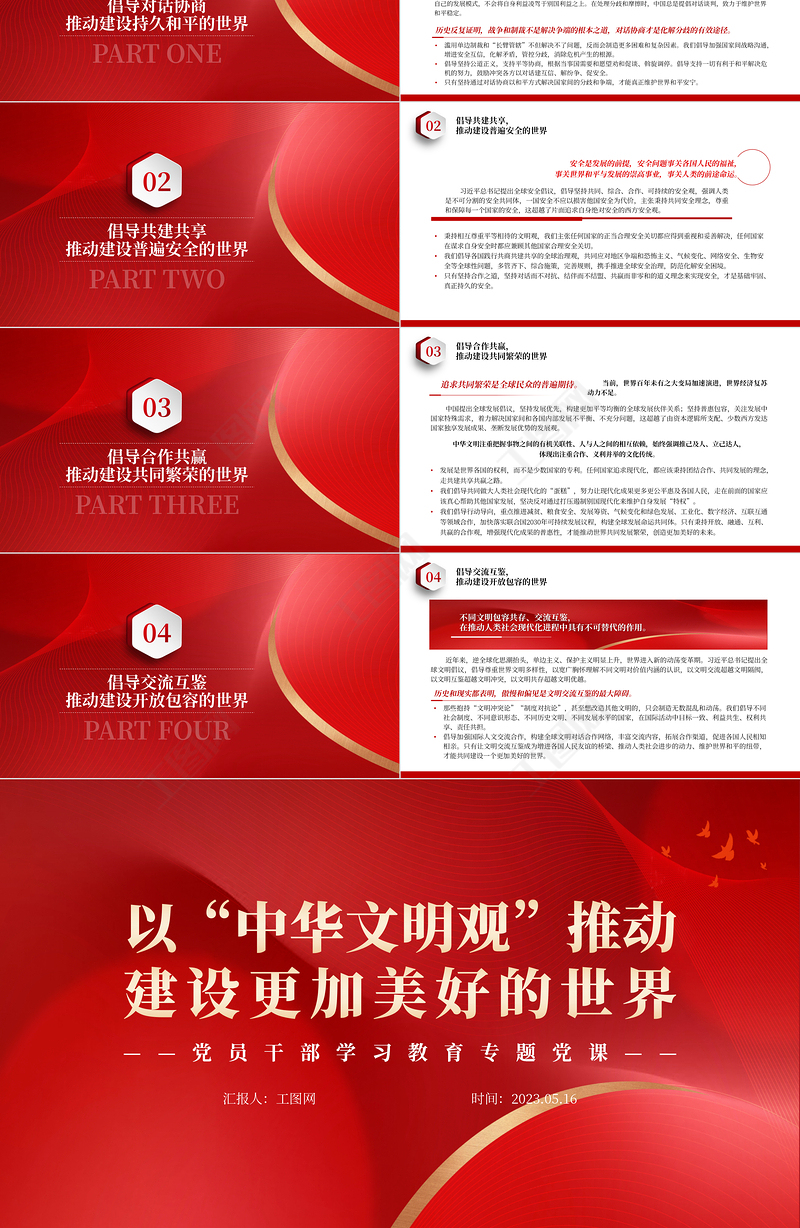 2023以“中華文明觀”推動(dòng)建設(shè)更加美好的世界PPT大氣精美風(fēng)黨員干部學(xué)習(xí)教育專題黨課課件 Array