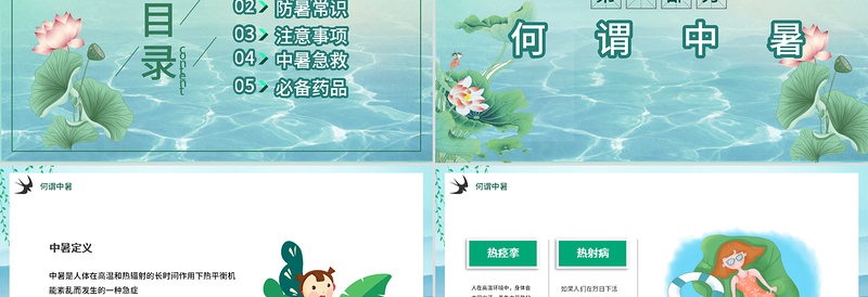防暑常識1.躲避烈日2.遮光防護3.補充水分4.增強營養(yǎng)5.備防暑藥上午10時到下午4時避免在烈日下行走,尤其孩子、老年人、孕婦、有慢性疾病的人,,特別是有心血管疾病的人,在高溫季節(jié)時段要盡可能地減少外出。如打遮陽散戴遮陽帽、戴太陽鏡、涂防曬霜、準備充足的飲料。養(yǎng)成良好的飲水習(xí)慣,通常最佳飲水時間是晨起后、上午10時、下午3—4時、晚上就寢前。蔬菜和水果亦可補充水分。平時可多喝綠豆湯、豆?jié){、酸梅湯等。隨身攜帶防暑藥物,如十滴水、藿香正氣水、清涼油、無極丹等