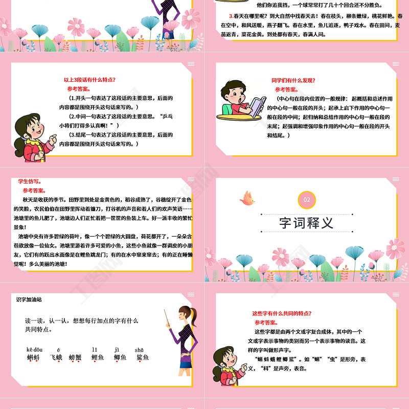 以上3段話有什么特點(diǎn)? 參考答案。 (1.開(kāi)頭一句表達(dá)了這段話的主要意思,后面的內(nèi)容都是圍繞開(kāi)頭這句話來(lái)寫(xiě)的。) (2.中間一句表達(dá)了這段話的主要意思?!捌古倚兇虻枚嗾J(rèn)真??!” ) (3.結(jié)尾一句表達(dá)了這段話的主要意思,后面的內(nèi)容都是圍繞開(kāi)頭這句話來(lái)寫(xiě)的。)