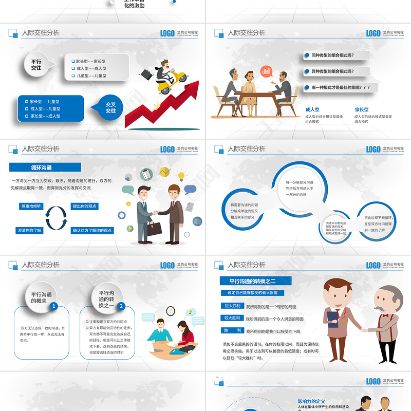 家長型----家長型 成人型----成人型 兒童型----兒童型平行交往交叉交往 家長型----兒童型 成人型----兒童型 家長型----成人型人際交往分析