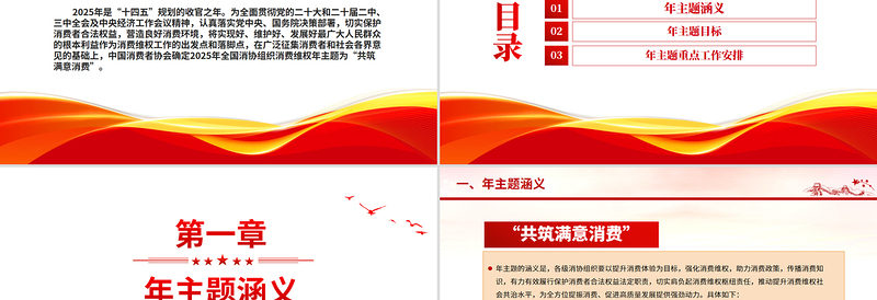 二、年主題目標(biāo)一是推進(jìn)社會共治,參與主體更具具廣度??钙鹣M(fèi)維權(quán)樞紐責(zé)任,凝聚社會各方力量,以提升老百姓消費(fèi)體驗(yàn)為目標(biāo),推動建立消費(fèi)維權(quán)社會共治格局。深入了解消費(fèi)者需求,全方位加強(qiáng)消費(fèi)者保護(hù),持續(xù)優(yōu)化消費(fèi)環(huán)境,讓消費(fèi)者敢消費(fèi)、愿消費(fèi)。1二是完善法律法規(guī),制度保障更具力度。以《消費(fèi)者權(quán)益保護(hù)法實(shí)施條例》宣貫為契機(jī),針對消費(fèi)新業(yè)態(tài)、新場景中出現(xiàn)的新問題,積極開展消費(fèi)維權(quán)理論與實(shí)務(wù)研究,提出高質(zhì)量的立法或監(jiān)管建議,推動完善相關(guān)法律法規(guī),為保護(hù)消費(fèi)者合法權(quán)益提供堅(jiān)實(shí)的法治保障。2