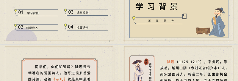 同學們,你們知道嗎?陸游是宋朝著名的愛國詩人。他寫過很多首愛國詩篇,這篇《示兒》就是其中最著名的一篇。