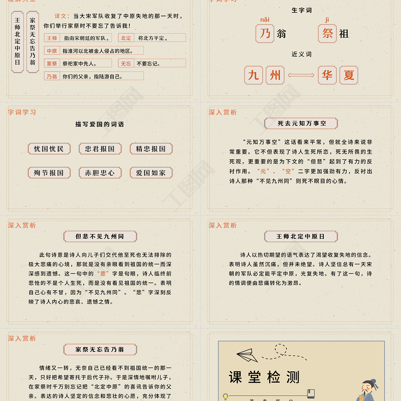 理解大意 譯文:當大宋軍隊收復了中原失地的那一天時,你們舉行家祭時不要忘了告訴我!中原 指淮河以北被金人侵占的地區(qū)。乃翁 你們的父親,指陸游自己。家祭 祭祀家中先人。無忘 不要忘記。