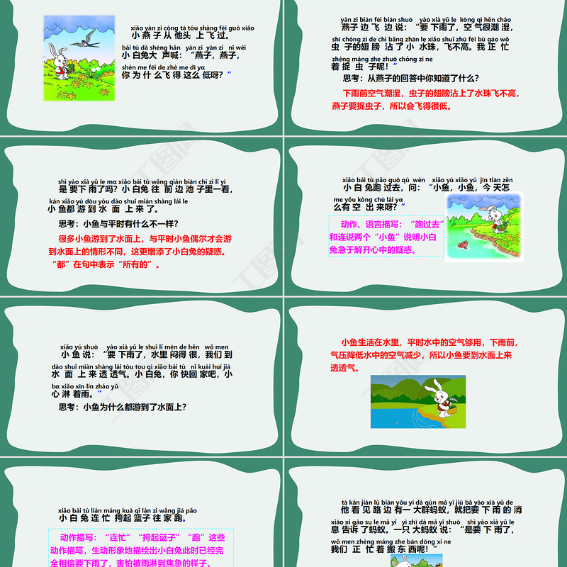 整體感知 仔細(xì)讀課文,找一找:要下雨了,小燕子、小魚和小螞蟻各有什么樣的表現(xiàn)?小白兔又是怎樣做的?