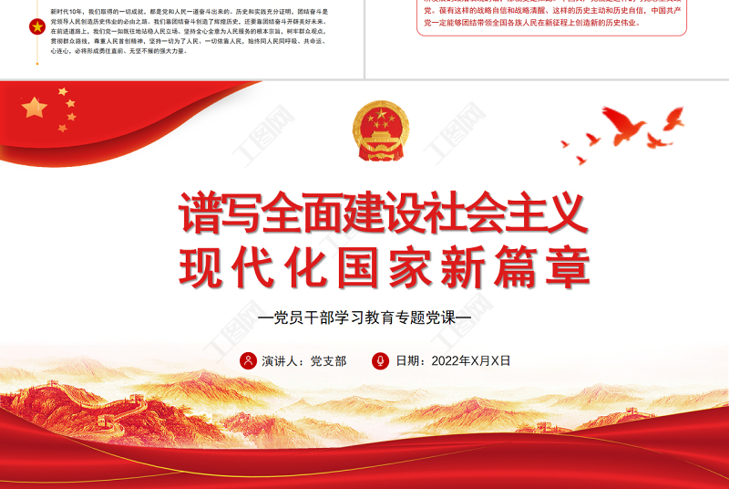 工圖網(wǎng)提供譜寫全面建設(shè)社會(huì)主義現(xiàn)代化國(guó)家新篇章PPT黨政風(fēng)黨員干部學(xué)習(xí)教育專題黨課課件模板供會(huì)員免費(fèi)下載。更多精彩黨課PPT素材,盡在工圖網(wǎng)。