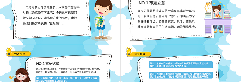 NO.2 素材選擇可供選擇的素材很多,只要是讀過的文章或書都可以寫。寫作前,要對(duì)寫什么了然于胸。一般來說,?可從五個(gè)方面的內(nèi)容切入:方法指導(dǎo)