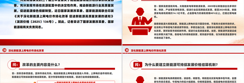 前言/PREFACE 為貫徹落實(shí)黨的二十屆三中全會關(guān)于推進(jìn)能源領(lǐng)域價(jià)格改革的決策部署,充分發(fā)揮市場在資源配置中的決定性作用,推動(dòng)新能源行業(yè)高質(zhì)量發(fā)展,促進(jìn)能源綠色低碳轉(zhuǎn)型,近日國家發(fā)展改革委、國家能源局聯(lián)合印發(fā)《關(guān)于深化新能源上網(wǎng)電價(jià)市場化改革 促進(jìn)新能源高質(zhì)量發(fā)展的通知》(發(fā)改價(jià)格〔2025〕136號)。就此,記者采訪了國家發(fā)展改革委、國家能源局有關(guān)負(fù)責(zé)同志。