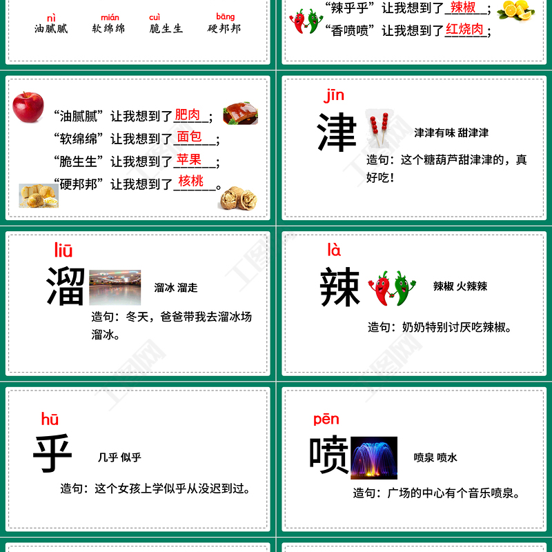 “油膩膩”讓我想到了_____; “軟綿綿”讓我想到了______; “脆生生”讓我想到了______; “硬邦邦”讓我想到了______。肥肉面包蘋果核桃