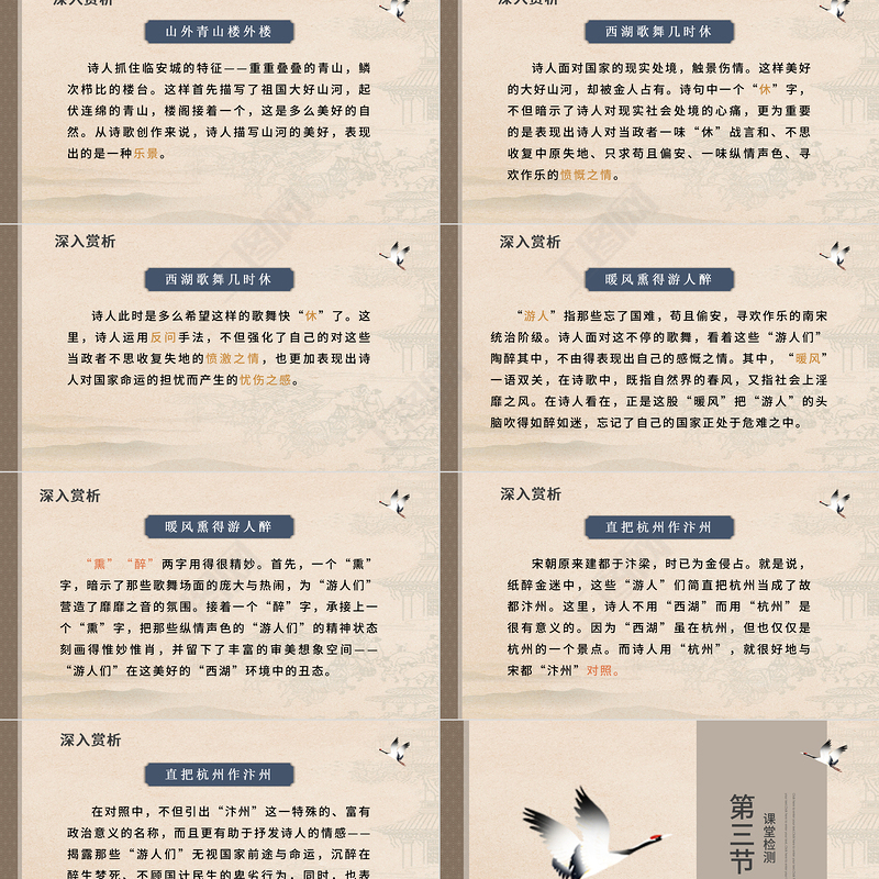 深入賞析 “熏”“醉”兩字用得很精妙。首先,一個“熏”字,暗示了那些歌舞場面的龐大與熱鬧,為“游人們”營造了靡靡之音的氛圍。接著一個“醉”字,承接上一個“熏”字,把那些縱情聲色的“游人們”的精神狀態(tài)刻畫得惟妙惟肖,并留下了豐富的審美想象空間——“游人們”在這美好的“西湖”環(huán)境中的丑態(tài)。