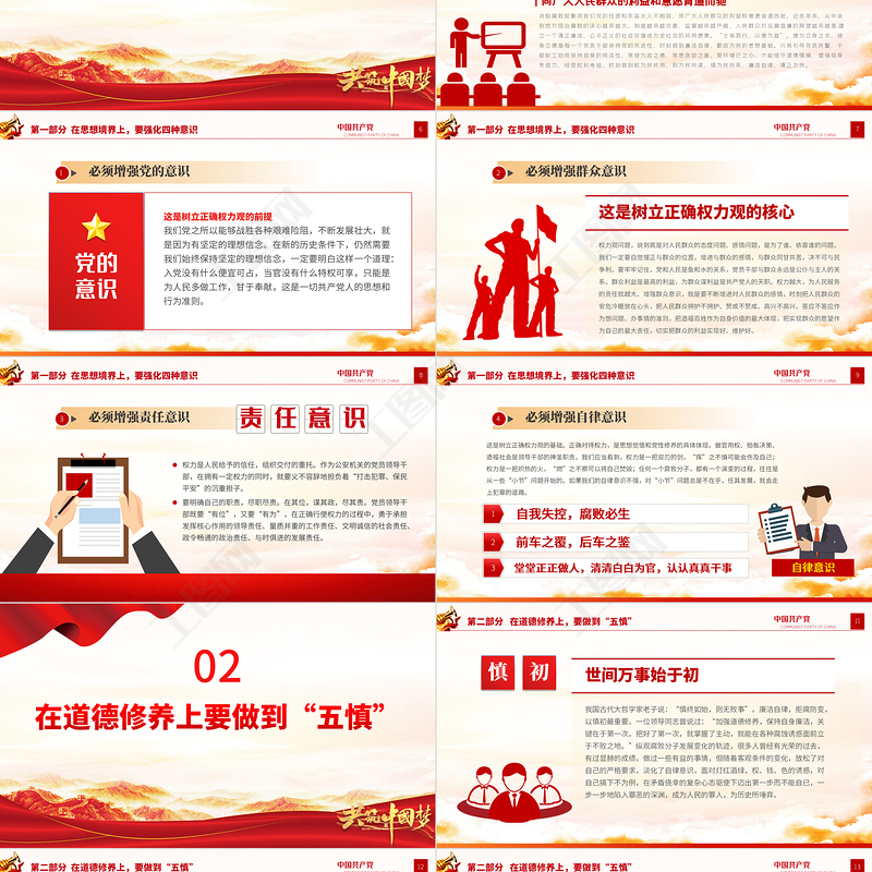 必須增強(qiáng)自律意識(shí)這是樹(shù)立正確權(quán)力觀的基礎(chǔ)。正確對(duì)待權(quán)力,是思想覺(jué)悟和黨性修養(yǎng)的具體體現(xiàn)。做官用權(quán)、拍板決策、造福社會(huì)是領(lǐng)導(dǎo)干部的神圣職責(zé)。我們應(yīng)當(dāng)看到,權(quán)力是一把雙刃的劍,“揮”之不慎可能會(huì)傷及自己;權(quán)力是一把熾熱的火,“燃”之不察可以將自己焚毀;任何一個(gè)腐敗分子,都有一個(gè)演變的過(guò)程,往往是從一些“小節(jié)”問(wèn)題開(kāi)始的。如果我們的自律意識(shí)不強(qiáng),對(duì)“小節(jié)”問(wèn)題總是不在乎,任其發(fā)展,就會(huì)走上犯罪的道路。自律意識(shí)自我失控,腐敗必生前車(chē)之覆,后車(chē)之鑒堂堂正正做人,清清白白為官,認(rèn)認(rèn)真真干事第一部分 在思想境界上,要強(qiáng)化四種意識(shí)
