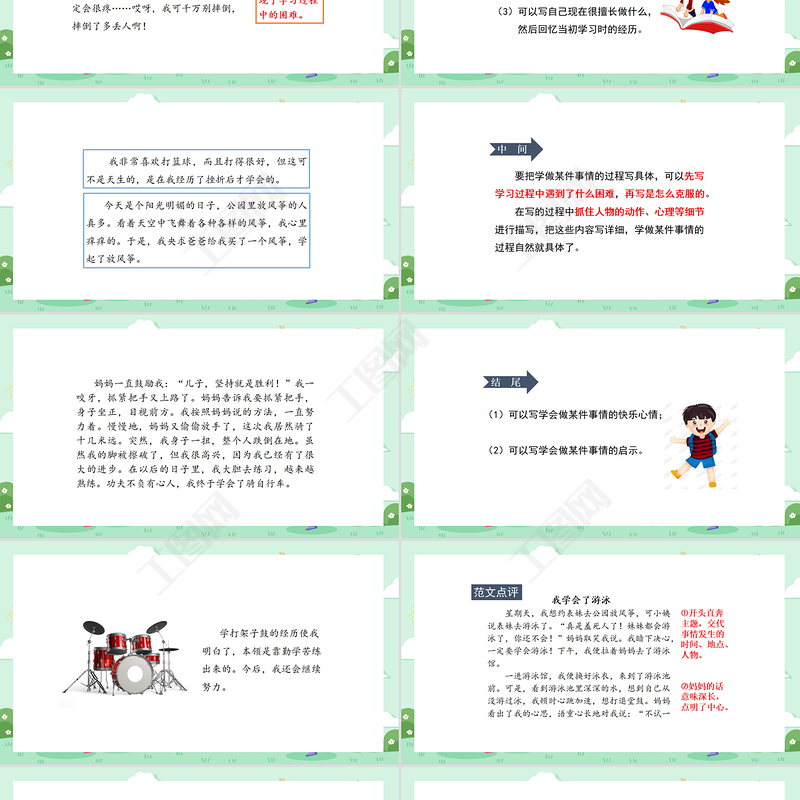 好開頭(鋪墊式)每次看到媽媽做飯,我的手都癢癢的。我曾經(jīng)多次請求媽媽教我學(xué)做飯,可媽媽怕我被燙著,每次都拒絕了。(選自《我學(xué)會了做飯》) (交代原因式)每次出門看到跟自己差不多大的孩子都能輕松地騎著自行車出行時,我心里羨慕極了。于是,我下定決心要學(xué)會騎自行車。(選自《我學(xué)會了騎自行車》)
