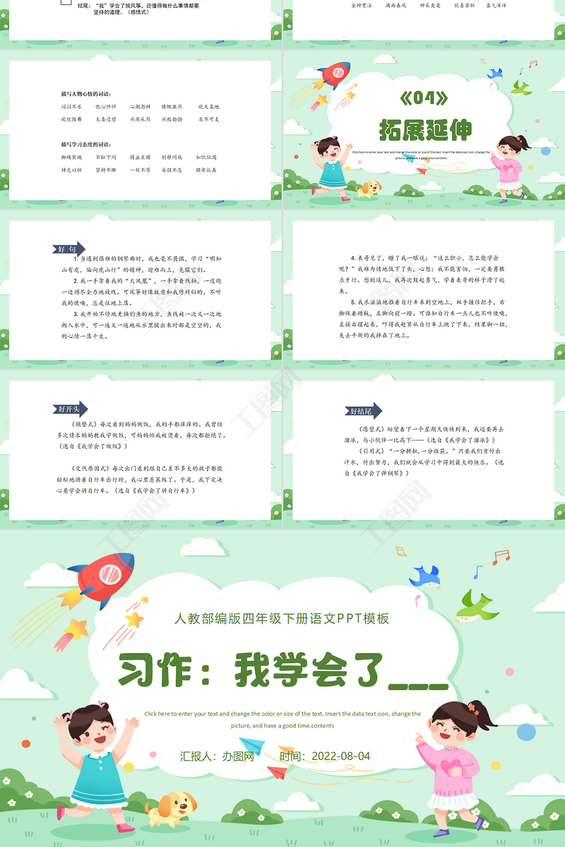 Click here to enter your text and change the color or size of the text. Insert the data text icon, change the picture, and have a good time.contents人教部編版四年級下冊語文PPT模板習(xí)作:我學(xué)會了___匯報(bào)人:辦圖網(wǎng) 時間:2022-08-04