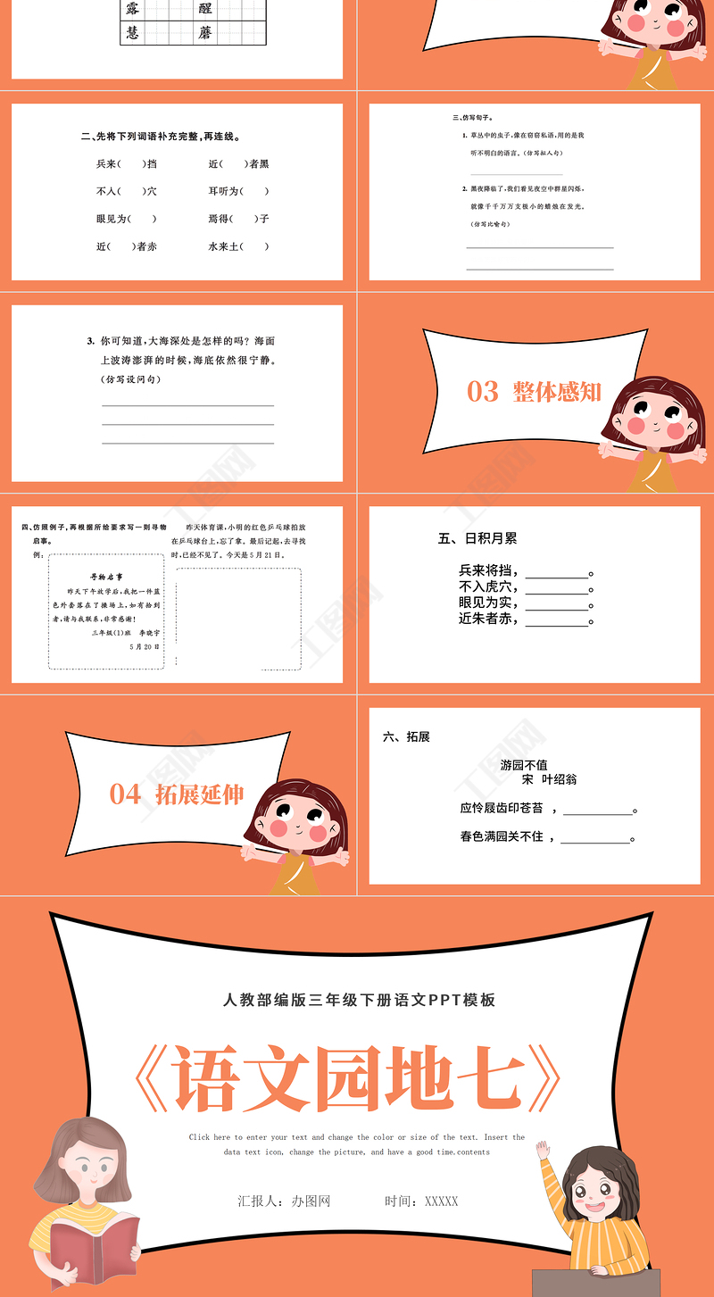 Click here to enter your text and change the color or size of the text. Insert the data text icon, change the picture, and have a good time.contents人教部編版三年級(jí)下冊(cè)語(yǔ)文PPT模板《語(yǔ)文園地七》匯報(bào)人:辦圖網(wǎng) 時(shí)間:XXXXX