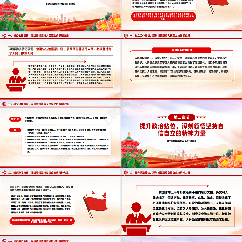 二、提升政治站位,深刻領(lǐng)悟堅(jiān)持自信自立的精神力量 我國(guó)作為五千年歷史連綿不絕的東方大國(guó),歷史和人民選擇了中國(guó)共產(chǎn)黨,我國(guó)經(jīng)濟(jì)、文化、社會(huì)、國(guó)情決定了必須堅(jiān)持和維護(hù)黨的領(lǐng)導(dǎo)。在黨的絕對(duì)領(lǐng)導(dǎo)下,人民法院堅(jiān)定正確政治方向,堅(jiān)持為大局服務(wù)、為人民司法,把維護(hù)國(guó)家政治安全特別是政權(quán)安全、制度安全放在第一位,恰是社會(huì)主義制度優(yōu)越性所在、人民當(dāng)家作主制度本質(zhì)要求所在。