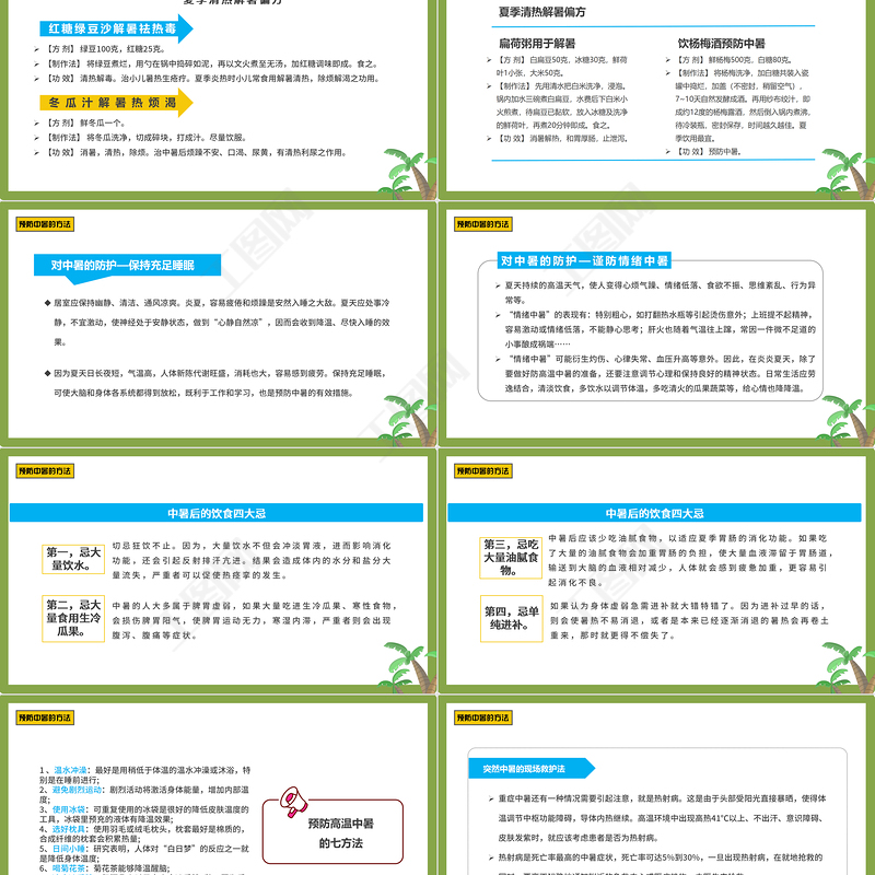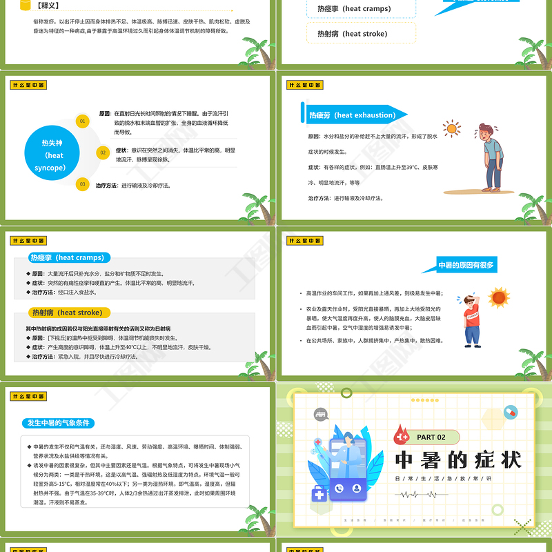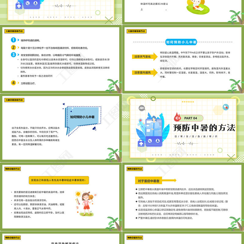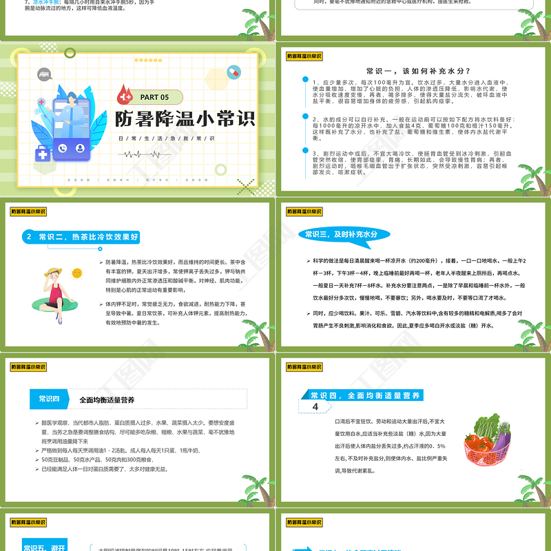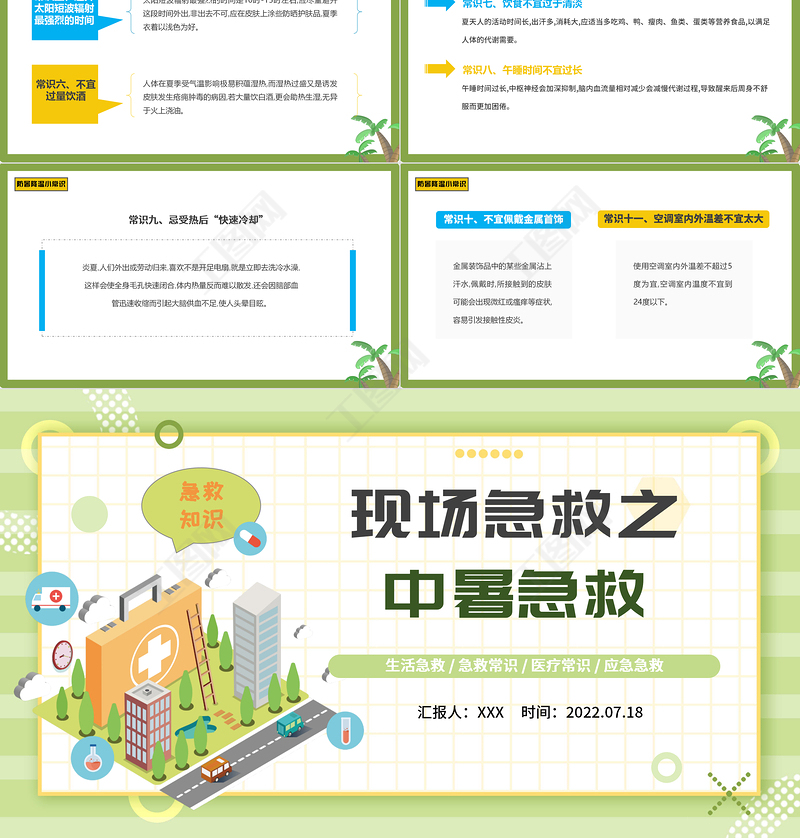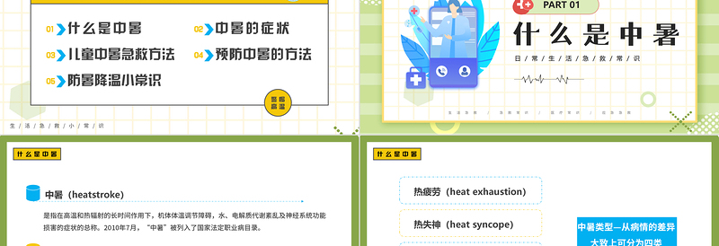 <p>急救知識生活急救 / 急救常識 / 醫(yī)療常識 / 應(yīng)急急救匯報人:XXX 時間:2022.07.18現(xiàn)場急救之中暑急救</p><br><p>目錄CONTANTS生/活/急/救/小/常/識</p><br><p>生活急救 / 急救常識 / 醫(yī)療常識 / 應(yīng)急急救</p><br><p>是指在高溫和熱輻射的長時間作用下,機(jī)體體溫調(diào)節(jié)障礙,水、電解質(zhì)代謝紊亂及神經(jīng)系統(tǒng)功能損害的癥狀的總稱。2010年7月,“中暑”被列入了國家法定職業(yè)病目錄。俗稱發(fā)痧。以出汗停止因而身體排熱不足、體溫極高、脈搏迅速、皮膚干熱、肌肉松軟、虛脫及昏迷為特征的一種病癥,由于暴露于高溫環(huán)境過久而引起身體體溫調(diào)節(jié)機(jī)制的障礙所致。 </p><br><p></p><br><p></p><br><p>原因:水分和鹽分的補(bǔ)給趕不上大量的流汗,形成了脫水癥狀的時候發(fā)生。 癥狀:有各樣的癥狀,例如:直腸溫上升至39℃、皮膚寒冷、明顯地流汗,等等 治療方法:進(jìn)行輸液及冷卻療法。 </p><br><p></p><br><p>在公共場所、家族中,人群擁擠集中,產(chǎn)熱集中,散熱困難。 高溫作業(yè)的車間工作,如果再加上通風(fēng)差,則極易發(fā)生中暑;農(nóng)業(yè)及露天作業(yè)時,受陽光直接暴曬,再加上大地受陽光的暴曬,使大氣溫度再度升高,使人的腦膜充血,大腦皮層缺血而引起中暑,空氣中濕度的增強(qiáng)易誘發(fā)中暑;</p><br><p>發(fā)生中暑的氣象條件中暑的發(fā)生不僅和氣溫有關(guān),還與濕度、風(fēng)速、勞動強(qiáng)度、高溫環(huán)境、曝曬時間、體制強(qiáng)弱、營養(yǎng)狀況及水鹽供給等情況有關(guān)?!?誘發(fā)中暑的因素很復(fù)雜,但其中主要因素還是氣溫。根據(jù)氣象特點(diǎn),可將發(fā)生中暑現(xiàn)場小氣候分為兩類:一類是干熱環(huán)境,這是以高氣溫、強(qiáng)輻射熱及低濕度為特點(diǎn),環(huán)境氣溫一般可較室外高5-15℃,相對濕度常在40%以下;另一類為濕熱環(huán)境,即氣溫高,濕度高,但輻射熱并不強(qiáng)。由于氣溫在35-39℃時,人體2/3余熱通過出汗蒸發(fā)排泄,此時如果周圍環(huán)境潮濕,汗液則不易蒸發(fā)?!?</p><br><p>生活急救 / 急救常識 / 醫(yī)療常識 / 應(yīng)急急救</p><br><p></p><br><p>根據(jù)臨床表現(xiàn)的輕重,中暑可分為先兆中暑、輕癥中暑和重癥中暑,而它們之間的關(guān)系是漸進(jìn)的。 </p><br><p>根據(jù)臨床表現(xiàn)的輕重,中暑可分為先兆中暑、輕癥中暑和重癥中暑,而它們之間的關(guān)系是漸進(jìn)的。 </p><br><p>重癥中暑分類癥狀 </p><br><p>重癥中暑分類癥狀 日射病癥狀特點(diǎn):這類中暑的原因正像它的名字一樣,是因?yàn)橹苯釉诹胰盏钠貢裣?,?qiáng)烈的日光穿透頭部皮膚及顱骨引起腦細(xì)胞受損,進(jìn)而造成腦組織的充血、水腫;由于受到傷害的主要是頭部,所以,最開始出現(xiàn)的不適就是劇烈頭痛、惡心嘔吐、煩躁不安,繼而可出現(xiàn)昏迷及抽搐。 </p><br><p>重癥中暑分類癥狀 </p><br><p>生活急救 / 急救常識 / 醫(yī)療常識 / 應(yīng)急急救</p><br><p>寶寶起先是膚色看似紅潤,但觸摸感覺干燥溫?zé)幔瑹┰瓴话布翱摁[,呼吸及脈搏加速接著會顯得倦怠、昏眩、抽搐、或進(jìn)入昏迷狀態(tài),測量體溫時可高達(dá)攝氏39度以上。 </p><br><p>全身可以溫涼的濕毛巾擦拭(以自來水潤濕即可;切勿以酒精或冰水取代),或放進(jìn)涼水(非冷水)浴盆里,使其體溫(肛溫)能降到攝氏39度即可,勿使體溫劇降成過低。切勿使用冰水或冰塊,因?yàn)檫^冷的冰水會使皮膚血管極度收縮,皮膚血流阻斷使無法繼續(xù)排熱。暑熱害者勿給予一般之退燒藥劑</p><br><p>特別留心高溫預(yù)報,中午到下午4點(diǎn)之間不要讓孩子到戶外活動;安排在涼快室內(nèi)午睡;熱天勤洗澡、擦身;飲食宜清談,多喝些淡鹽開水、綠豆湯。 即使是有空調(diào)的房間,也要在早晚定時開窗通風(fēng),避免室內(nèi)外溫差太大。同時要控制一定濕度,長夏屬濕,濕度大、悶熱,影響排汗,易中暑。 </p><br><p>出汗會丟失鹽分,不能只飲白開水,應(yīng)喝淡鹽水或鹽汽水。含糖多的飲料、牛奶飲多了易產(chǎn)氣、腹脹??珊纫恍r果汁,可以每天吃適量西瓜,因西瓜中富含水分及人體所需的多種糖類和維生素類,有一定的降溫解暑功效。 </p><br><p>生活急救 / 急救常識 / 醫(yī)療常識 / 應(yīng)急急救</p><br><p>首先要做的是迅速撤離引起中暑的高溫環(huán)境,選擇陰涼通風(fēng)的地方休息;并多飲用一些含鹽分的清涼飲料。還可以在額部、顳部涂抹清涼油、風(fēng)油精等,或服用人丹、十滴水、藿香正氣水等中藥。如果出現(xiàn)血壓降低、虛脫時應(yīng)立即平臥,及時上醫(yī)院靜脈滴注鹽水。 </p><br><p></p><br><p>夏季清熱解暑偏方【方 劑】 綠豆100克,紅糖25克。 【制作法】 將綠豆煮爛,用勺在鍋中搗碎如泥,再以文火煮至無湯,加紅糖調(diào)味即成。食之。 【功 效】 清熱解毒。治小兒暑熱生瘡疔。夏季炎熱時小兒常食用解暑清熱,除煩解渴之功用。 【方 劑】 鮮冬瓜一個。 【制作法】 將冬瓜洗凈,切成碎塊,打成汁。盡量飲服。 【功 效】 消暑,清熱,除煩。治中暑后煩躁不安、口渴、尿黃,有清熱利尿之作用。 </p><br><p></p><br><p>居室應(yīng)保持幽靜、清潔、通風(fēng)涼爽。炎夏,容易疲倦和煩躁是安然入睡之大敵。夏天應(yīng)處事冷靜,不宜激動,使神經(jīng)處于安靜狀態(tài),做到“心靜