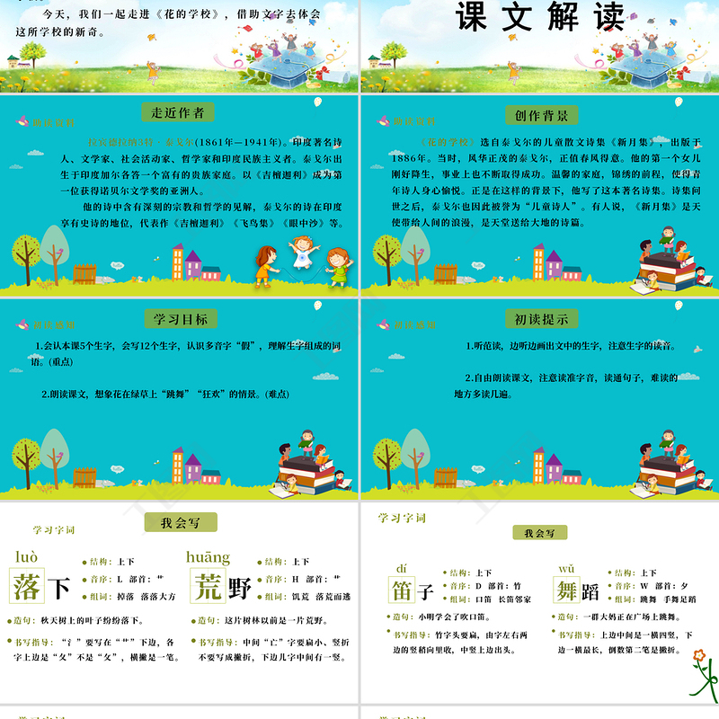 《花的學(xué)校》選自泰戈?duì)柕膬和⑽脑?shī)集《新月集》,出版于1886年。當(dāng)時(shí),風(fēng)華正茂的泰戈?duì)?,正值春風(fēng)得意。他的第一個(gè)女兒剛好降生,事業(yè)上也不斷取得成功。溫馨的家庭,錦繡的前程,使得青年詩(shī)人身心愉悅。正是在這樣的背景下,他寫(xiě)了這本著名詩(shī)集。詩(shī)集問(wèn)世之后,泰戈?duì)栆惨虼吮蛔u(yù)為“兒童詩(shī)人”。有人說(shuō),《新月集》是天使帶給人間的浪漫,是天堂送給大地的詩(shī)篇。助讀資料