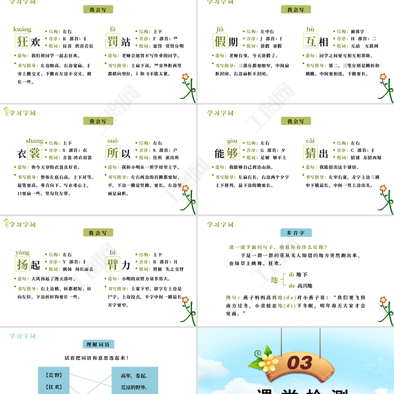 課堂檢測(cè)1.選擇正確的讀音2.在文中找出下面詞語(yǔ)的反義詞放假(jià jiǎ) 荒野(huāng hāng) 碰觸(zhù chù) 雙臂(bèi bì) 衣裳(shang sang) 狂風(fēng)(kuáng huáng) 天上—( ) 干燥—( ) 鬧市—( ) 假—( ) 獎(jiǎng)—( ) 放下—( ) 進(jìn)去—( ) 有—( ) 慢慢騰騰—( )