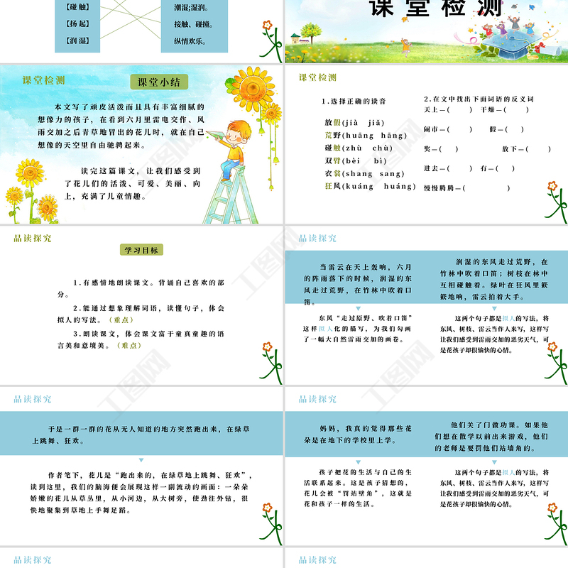 本文寫(xiě)了頑皮活潑而且具有豐富細(xì)膩的想像力的孩子,在看到六月里雷電交作、風(fēng)雨交加之后青草地冒出的花兒時(shí),就在自己想像的天空里自由馳騁起來(lái)。 讀完這篇課文,讓我們感受到了花兒們的活潑、可愛(ài)、美麗、向上,充滿了兒童情趣。課堂檢測(cè)