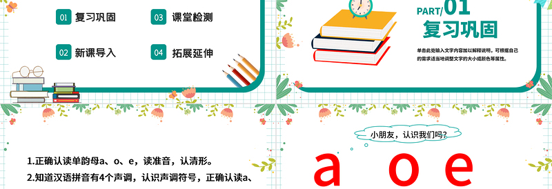 同學(xué)們,上節(jié)課我們認(rèn)識了拼音里的單韻母 “a o e”,并且會讀了它們的四聲聲調(diào),但是它們住在哪里呢?和老師一起去看看吧!
