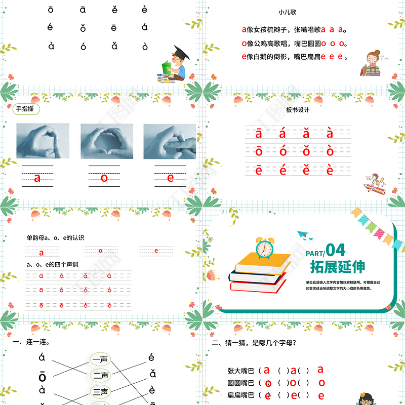 小兒歌e像白鵝的倒影,嘴巴扁扁e e e 。a像女孩梳辮子,張嘴唱歌a a a。o像公雞高歌唱,嘴巴圓圓o o o。