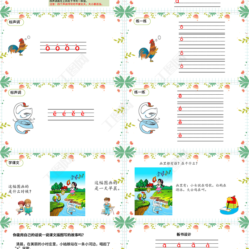你能用自己的話說一說課文插圖寫的故事嗎? 清晨,在美麗的小村莊里,小姑娘站在一條小河邊,唱起了“a”字歌。 大公雞看到了小姑娘在唱歌,它也張圓了嘴巴“o、o、o”地唱了起來。 在水中游玩的大白鵝,聽著美妙的歌聲跳起了舞蹈。旁邊的鵝寶寶看見了大白鵝的倒影“e、e、e”也高興地在水中玩了起來。 這是一個多么美好的早晨??!