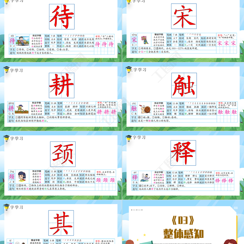生字學習形近字待(dài):守株待兔 等待 侍(shì):服侍 侍衛(wèi) 特(tè):特立獨行 特別 株(zhū):株連 一株桃樹 蛛(zhū):蜘蛛 蛛絲馬跡 珠(zhū):珍珠 珠光寶氣