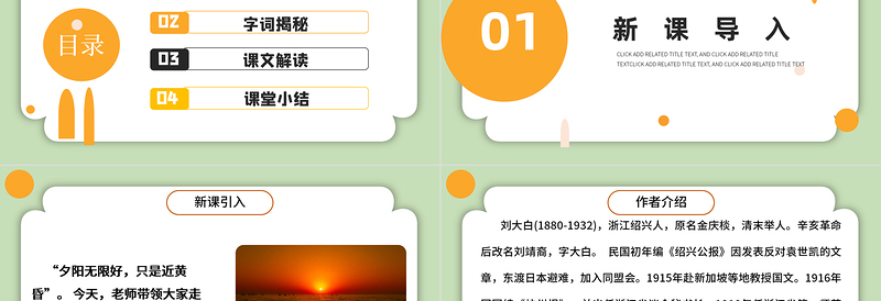 “夕陽無限好,只是近黃昏”。 今天,老師帶領(lǐng)大家走進書本,走近夕陽,走近黃昏,走進大自然。新課引入