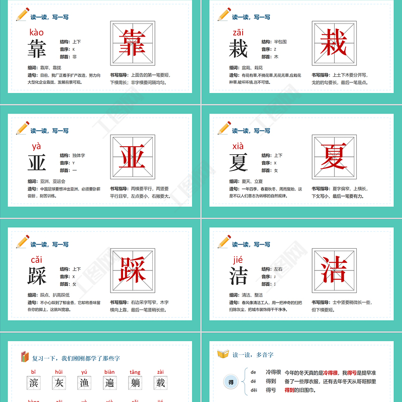 夏夏xià結(jié)構(gòu):上下 音序:X 部首:夂組詞:夏天、立夏 造句:一年四季,春夏秋冬,周而復(fù)始,這是不以人們意志為轉(zhuǎn)移的自然規(guī)律。書寫指導(dǎo):夏字偏窄,上橫長(zhǎng),下夂寫小,最后一筆要有力。
