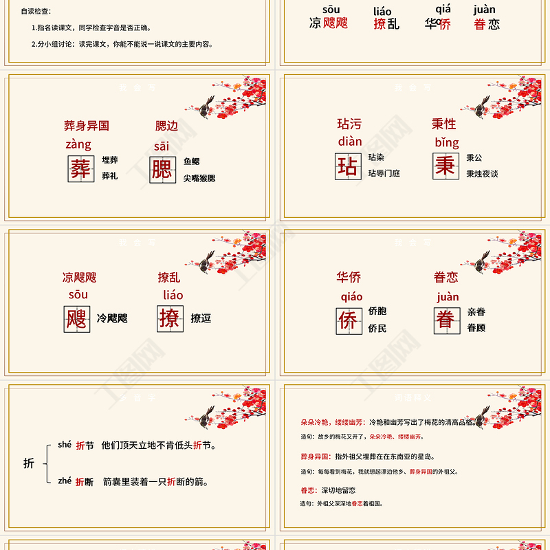 朵朵冷艷,縷縷幽芳:冷艷和幽芳寫出了梅花的清高品格。造句:故鄉(xiāng)的梅花又開了,朵朵冷艷、縷縷幽芳。詞語釋義葬身異國:指外祖父埋葬在在東南亞的星島。造句:每每看到梅花,我就想起漂泊他鄉(xiāng)、葬身異國的外祖父。眷戀:深切地留戀 造句:外祖父深深地眷戀著祖國。