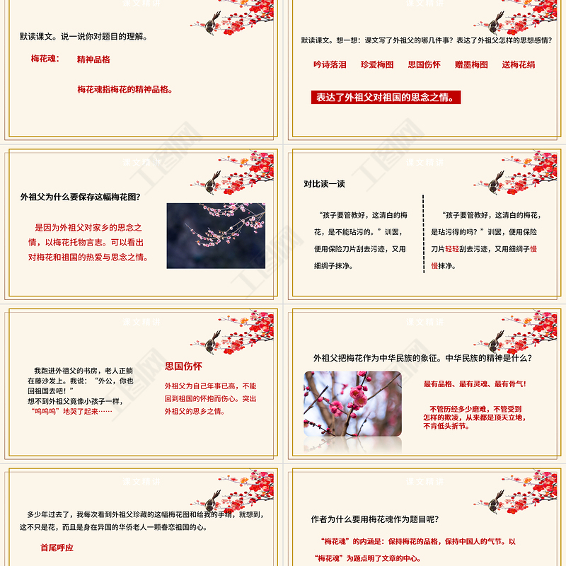“梅花魂”的內(nèi)涵是:保持梅花的品格,保持中國人的氣節(jié)。以“梅花魂”為題點(diǎn)明了文章的中心。作者為什么要用梅花魂作為題目呢?課文精講