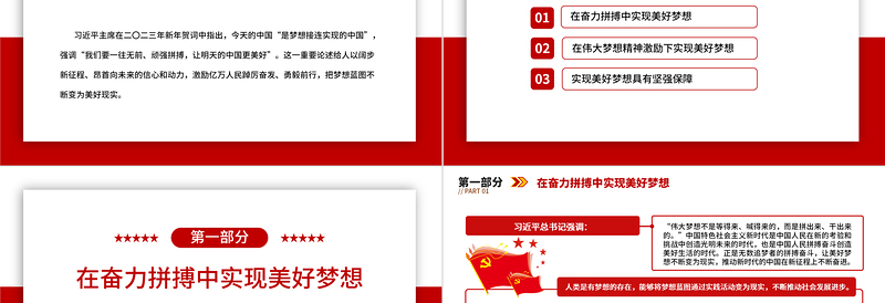 目錄CONTENTS010203在奮力拼搏中實(shí)現(xiàn)美好夢(mèng)想在偉大夢(mèng)想精神激勵(lì)下實(shí)現(xiàn)美好夢(mèng)想實(shí)現(xiàn)美好夢(mèng)想具有堅(jiān)強(qiáng)保障
