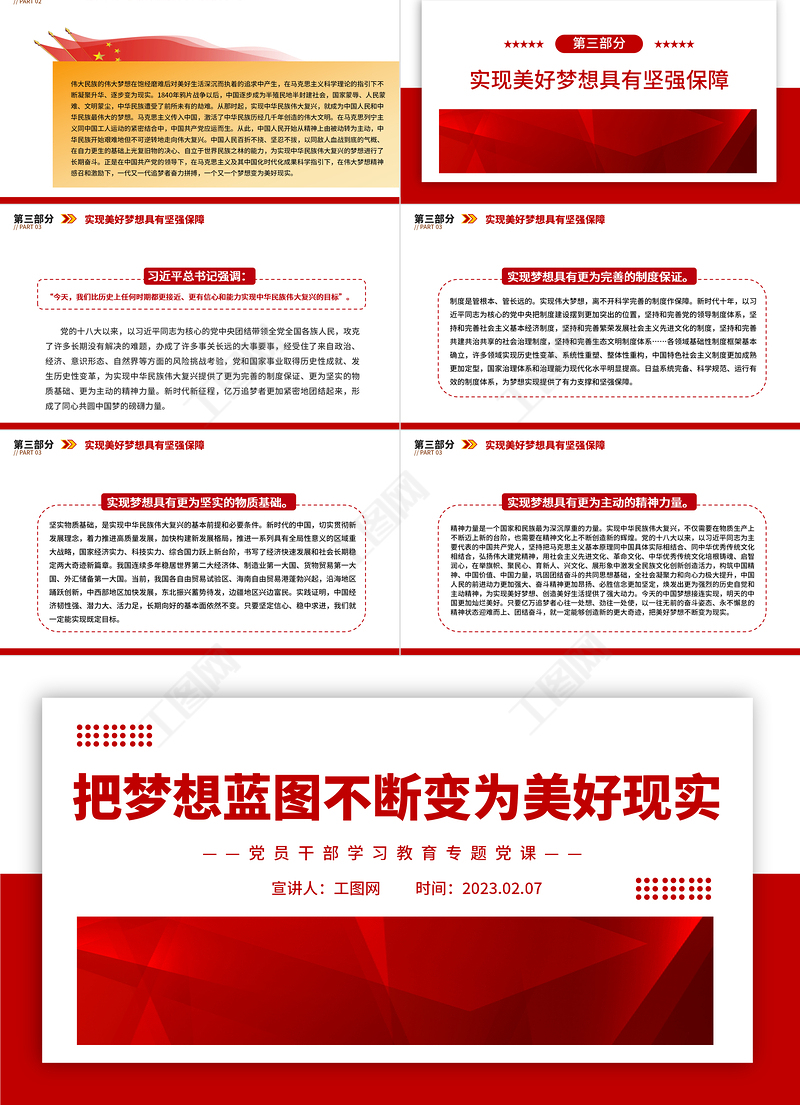 工圖網(wǎng)提供2023把夢(mèng)想藍(lán)圖不斷變?yōu)槊篮矛F(xiàn)實(shí)PPT大氣精美風(fēng)黨員干部學(xué)習(xí)教育專題黨建課件供會(huì)員免費(fèi)下載。更多精彩黨課PPT素材,盡在工圖網(wǎng)。