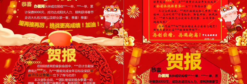賀報XXXXXXXX: 在剛剛結束的金秋會戰(zhàn)中,***總計貢獻保費高達***萬,為***提前完成全年目標及榮獲全省承保保費第一立下了悍馬功勞! 本次金秋會戰(zhàn),**團隊繼續(xù)發(fā)揚永爭第一的精神,充分利用**停售機會,勤奮拜訪,挑戰(zhàn)新高。**團隊依然充分發(fā)揮自身優(yōu)勢,拓展市場,超越自我! 在此代表***向**全體將士表示感謝與祝賀!同時希望你們在***經理的帶領下~中支總經理室2019.1.22再創(chuàng)佳績,再現新高!