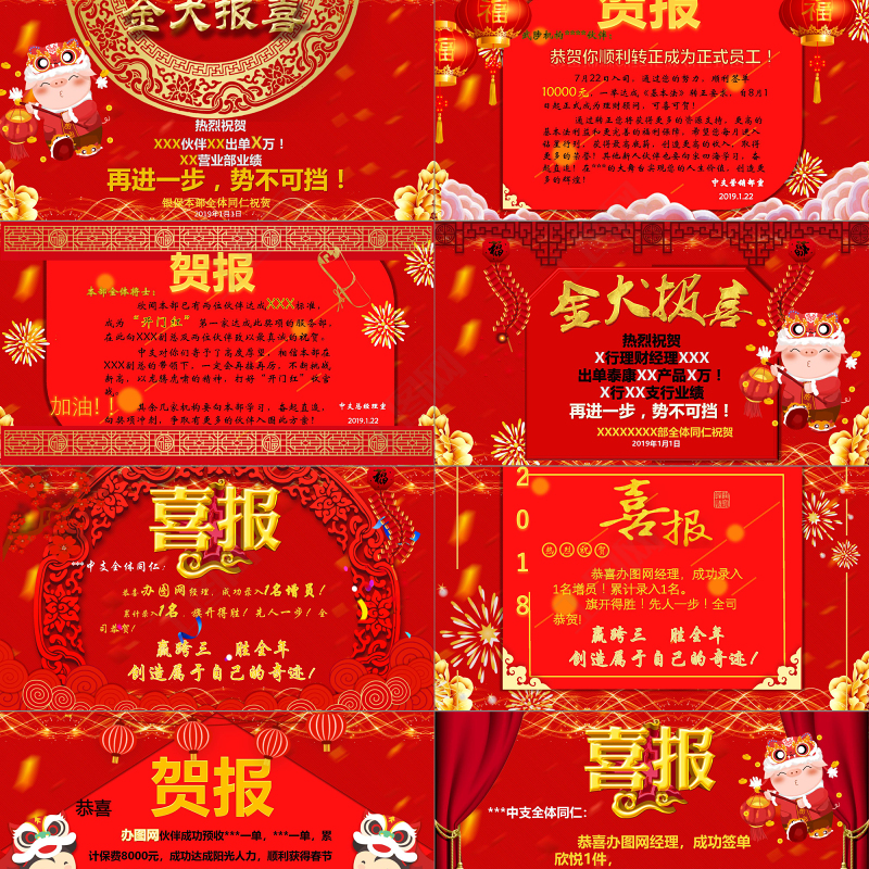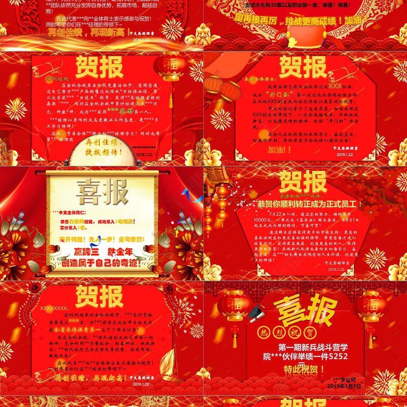 本部全體將士: 欣聞本部已有兩位伙伴達成XXX標準,成為“開門紅”第一家達成此獎項的服務部,在此向XXX副總及兩位伙伴致以最真誠的祝賀。 中支對你們寄予了高度厚望,相信本部在XXX副總的帶領下,一定會再接再厲,不斷挑戰(zhàn)新高,以龍騰虎嘯的精神,打好“開門紅”收官戰(zhàn)。 其余幾家機構要向本部學習,奮起直追,向獎項沖刺,爭取有更多的伙伴入圍此方案!加油!!中支總經理室2019.1.22賀報