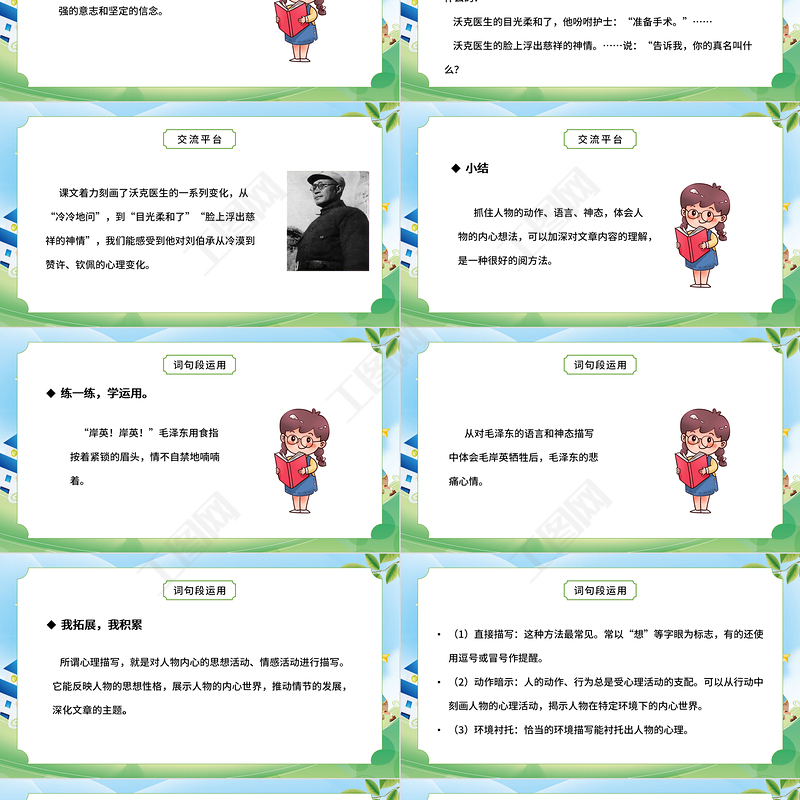 抓住人物的動作、語言、神態(tài),體會人物的內(nèi)心想法,可以加深對文章內(nèi)容的理解,是一種很好的閱方法。小結(jié)交流平臺